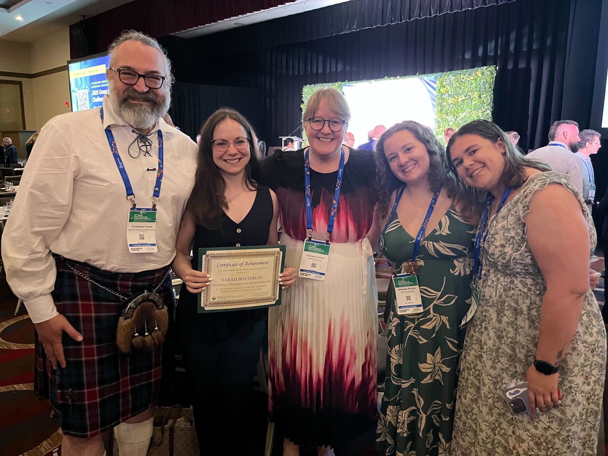 Prof. Kerton, Prof. Kozak, Sarah, Mikhailey, and Olivia presented at the ACS Green Chemistry & Engineering Conference in Pittsburgh, PA. Before the conference officially started, Olivia took part of a service project in North Pittsburgh neighbourhoods and helped organized Beyond Benign’s Green Chemistry Committment summit with Mikhailey and other international students. At this summit, Prof. Kerton was invited to give a short presentation. At the awards banquet on the first evening, Sarah accepted the Joseph Breen Memorial Fellowship from the ACS GCI.